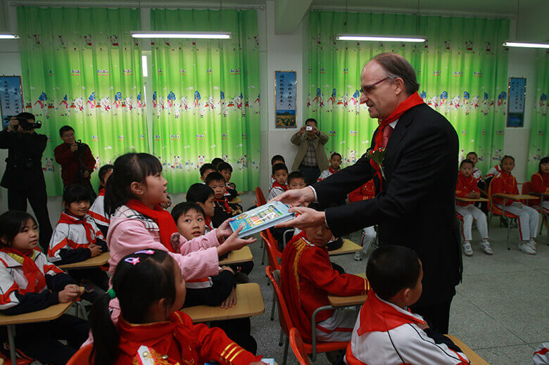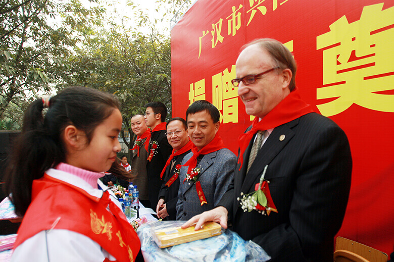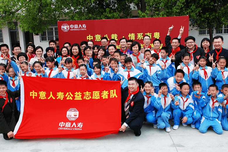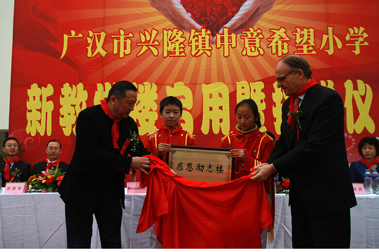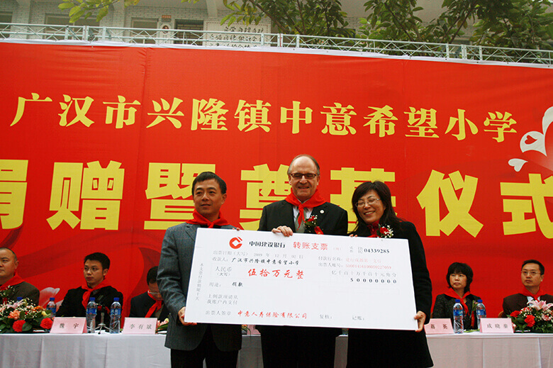 2008年5月12日,8.0級的強烈地震襲擊了四川汶川。消息傳來,中意人壽向受災較為嚴重的四川省廣漢市興隆鎮伸出了援手——捐助50萬元用于興隆鎮中心小學的重建,重建后的小學將更名為廣漢市興隆鎮“中意希望小學”。2009年12月2日,“中意希望小學”捐贈暨奠基儀式隆重舉行。時任中意人壽總經理易思樂代表公司向小學捐贈了善款及200套嶄新的書包和文具。2010年,重新修建的教學樓在校園內矗立起來,它高達4層,建筑面積2200平方米,可容納700余名學生就讀,并設有多媒體教室等先進教學設施,極大地改善學校的基礎教育條件。2010年11月18日, “中意希望小學”新教學樓啟用暨捐贈儀式隆重舉行。在啟用儀式現場,中意人壽還向希望小學捐贈了電腦等一批教學設備和籃球、乒乓球拍、羽毛球拍、棋類等體育用品。