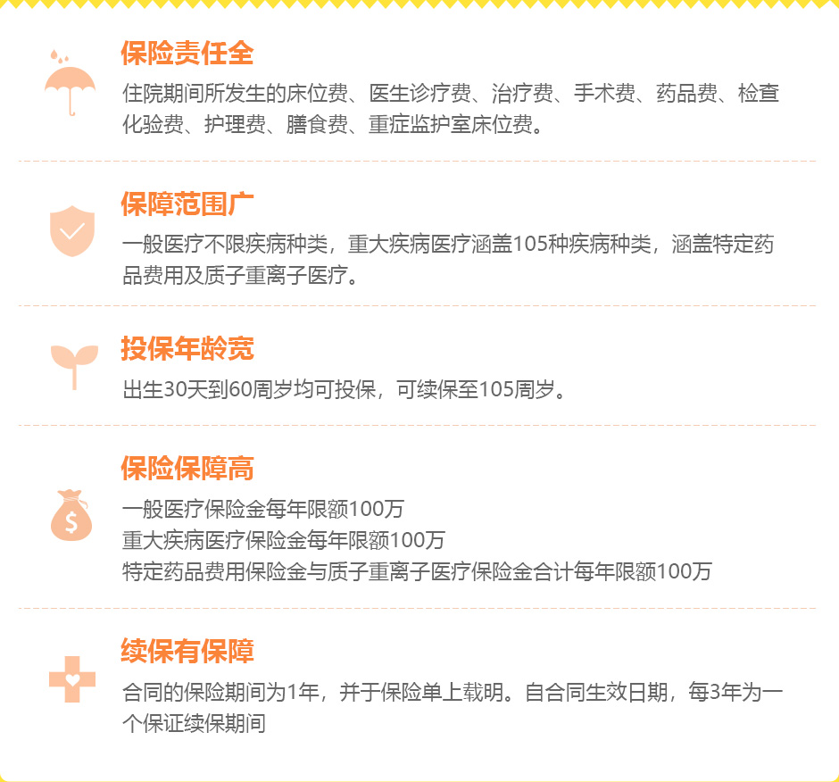 投保年齡:首次投保出生30天-60周歲,最長可續保至105周歲